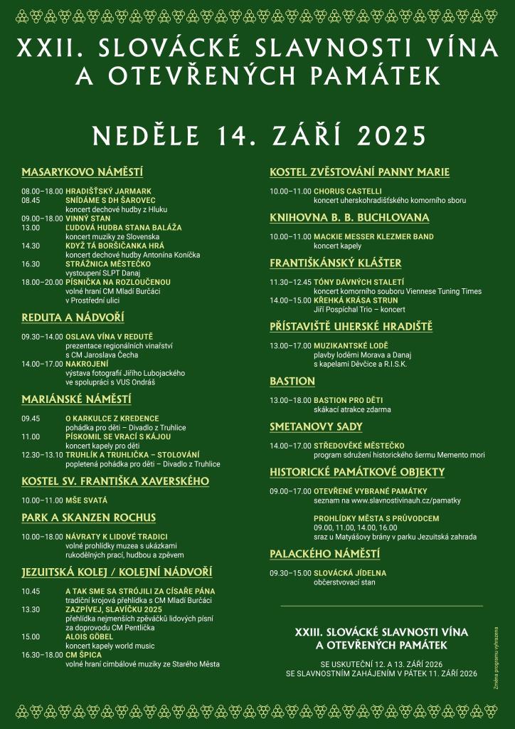 Srdečně vás zveme do srdce Slovácka – do Uherského Hradiště, kde se i letos rozezní tóny lidové hudby, ulice se zaplní kroji a rozvoní se víno z místních sklípků. Naši obec budou reprezentovat Bobkovníci v sobotu 13. září od 12:30 hodin na Mariánském náměstí v bloku Východního Slovácka.