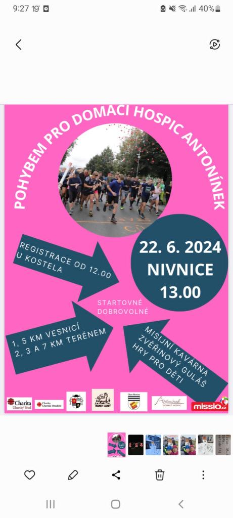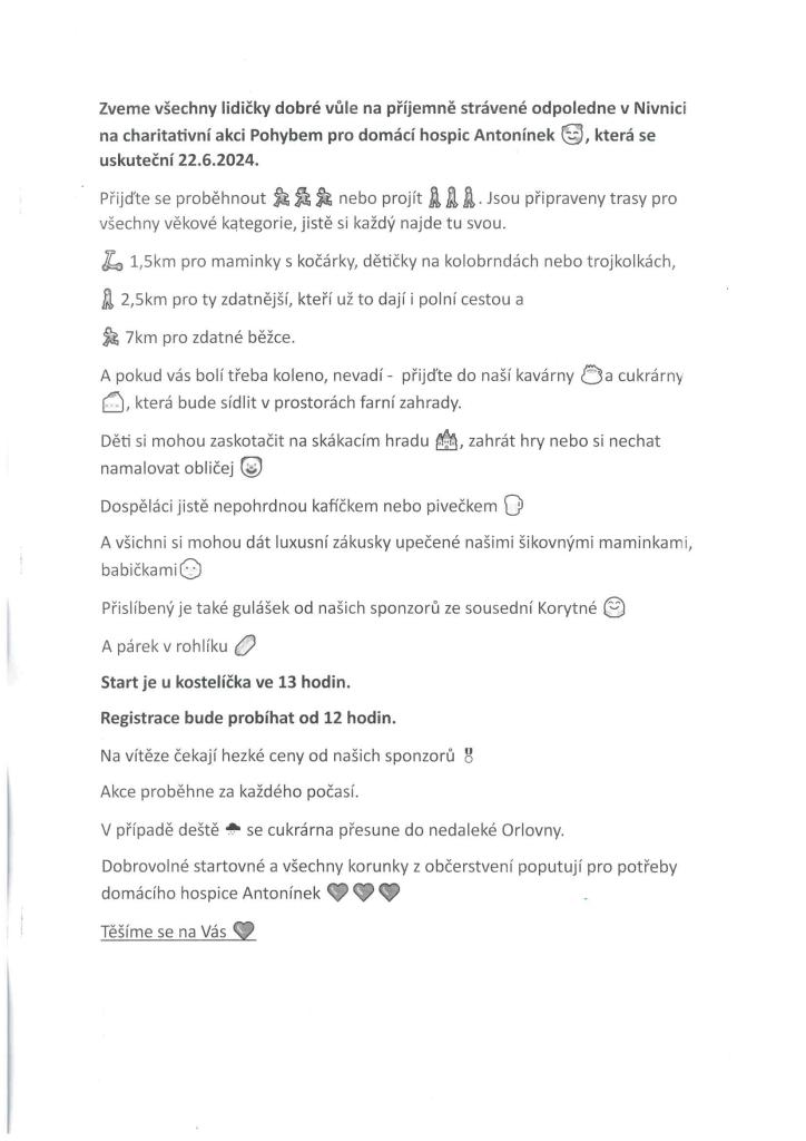 Zveme všechny lidičky dobré vůle na příjemně strávené odpoledne v Nivnici na charitativní akci Pohybem pro domácí hospic Antonínek ????, která se uskuteční 22.6.2024. Podrobnější informace v přiloženém letáku.