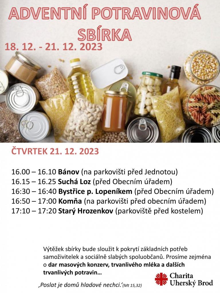 Ve čtvrtek 21. 12. 2023 od 16:30 do 16:40 se bude konat před obecním úřadem Adventní potravinová sbírka. Charita Uherský Brod prosí zejména o dar masových konzerv, trvanlivého mléka a dalších trvanlivých potravin.