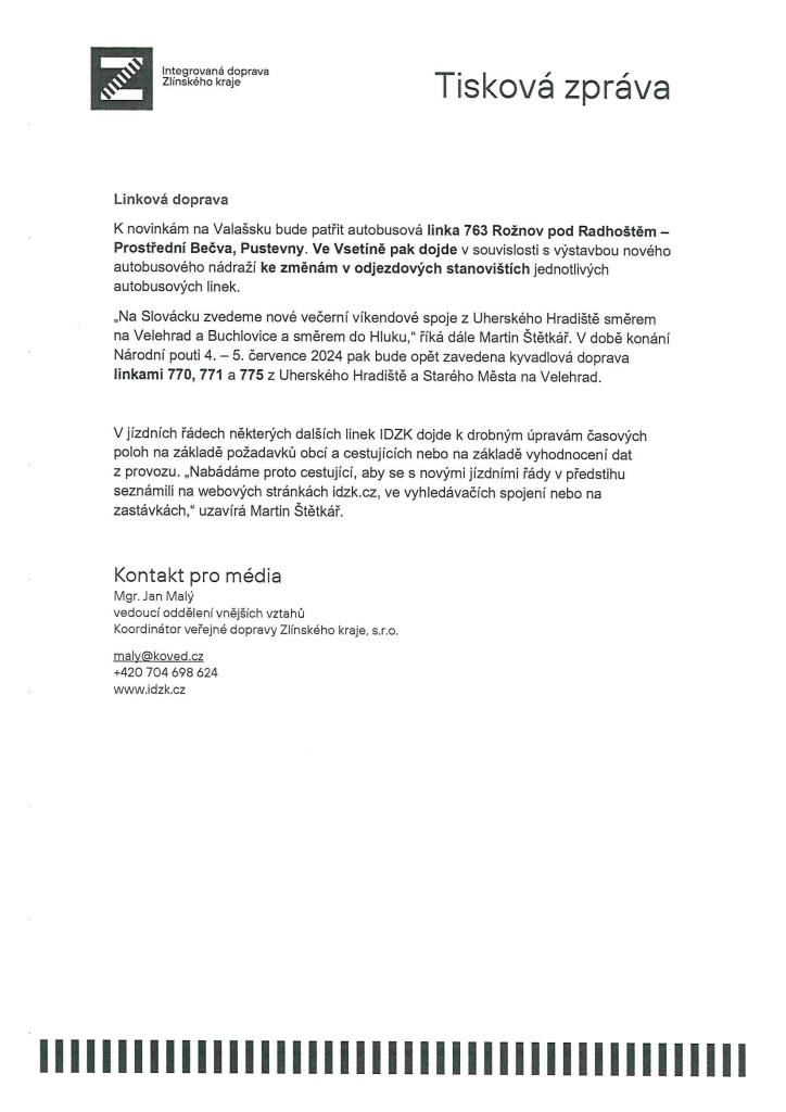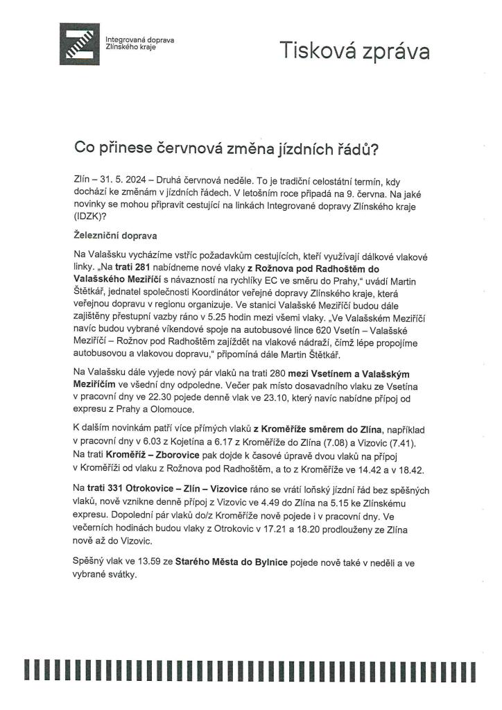 dochází ke změnám v jízdních řádech. V letošním roce připadá na 9. června. Na jaké novinky se mohou připravit cestující, se můžete dočíst v přiloženém letáku.