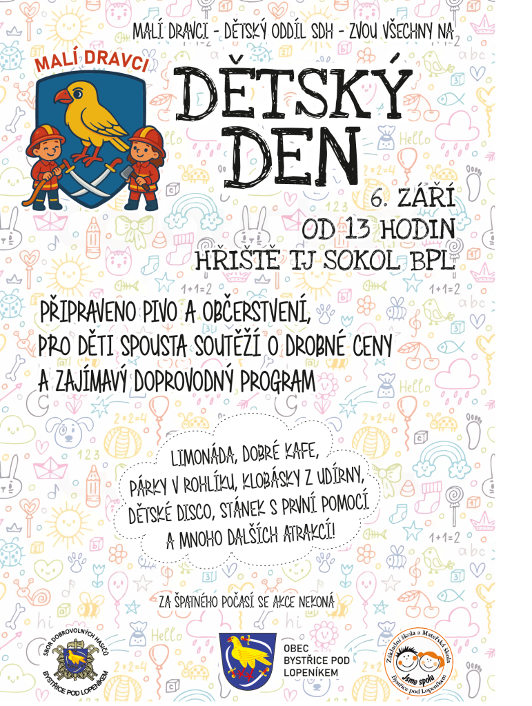 Malí dravci - dětský oddíl SDH zvou všechny na Den pro děti, který se uskuteční 6. září od 13 hodin na hřišti TJ Sokol BPL. Na programu je bohaté občerstvení, včetně limonády a klobásek, a pro děti budou připraveny soutěže a zábavný doprovodný program. V případě nepříznivého počasí se akce nekoná.