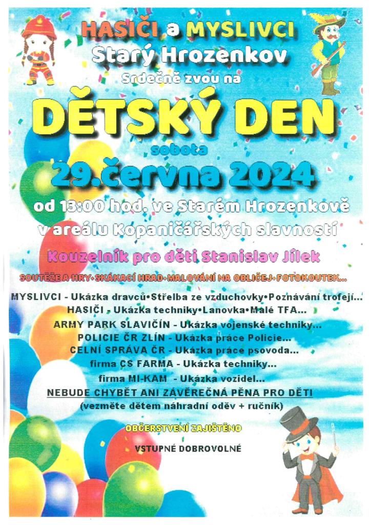 Hasiči a myslivci Starý Hrozenkov srdečně zvou v sobotu 29. června od 13:00 hodin v areálu Kopaničářských slavností na Dětský den. Občerstvení zajištěno, vstupné dobrovolné. Bohatý program v přiloženém letáku.