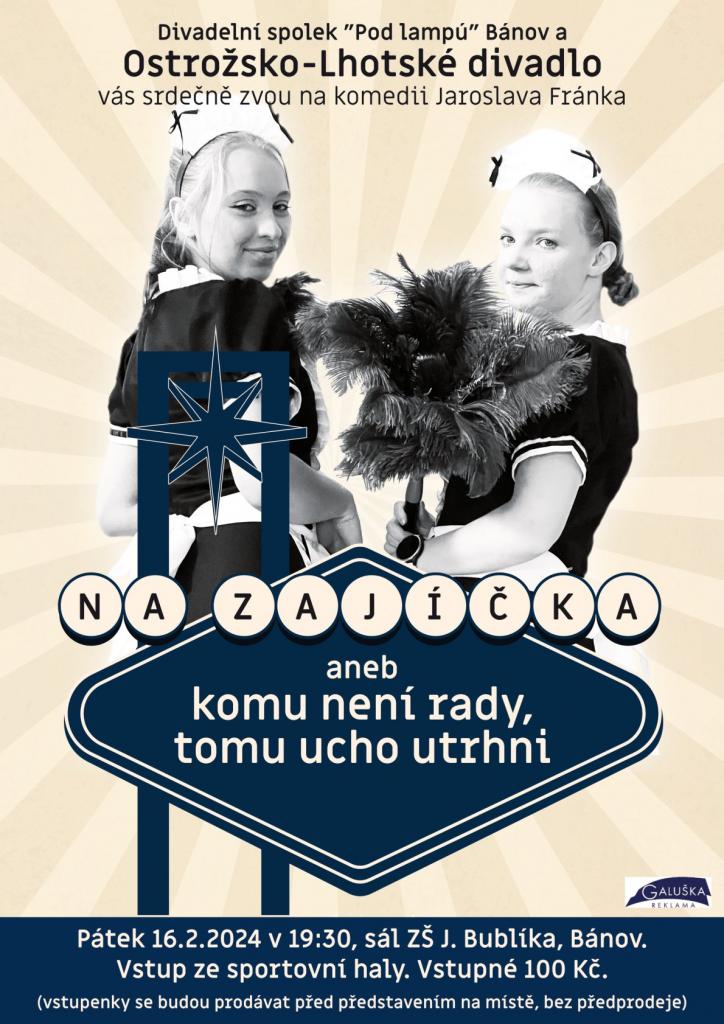 Divadelní spolek "Pod lampú" srdečně zve na komedii Jaroslava Fránka "Na zajíčka aneb komu není rady, tomu ucho utrhni". Představení se bude konat v pátek 16. 2. v 19:30 hodin, sál ZŠ J.Bublíka v Bánově. Vstup ze sportovní haly. Vstupné 100,- Kč.