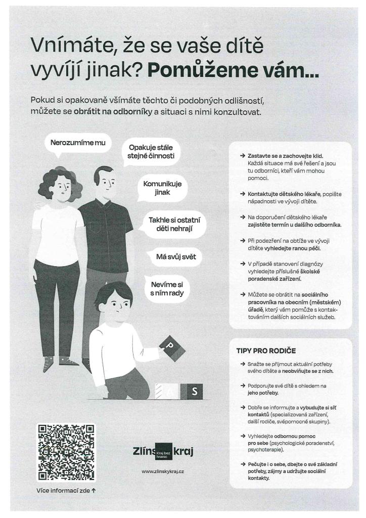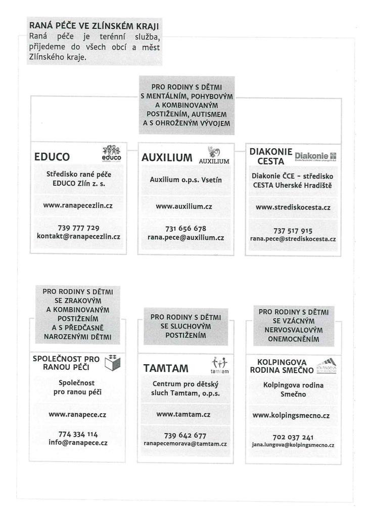 První leták obsahuje všechny poskytovatele rané péče, kteří působí ve Zlínském kraji a pokrývají veškeré typy handicapů u dětí. Druhý leták směruje pečující na odbornou pomoc přímo v této oblasti.