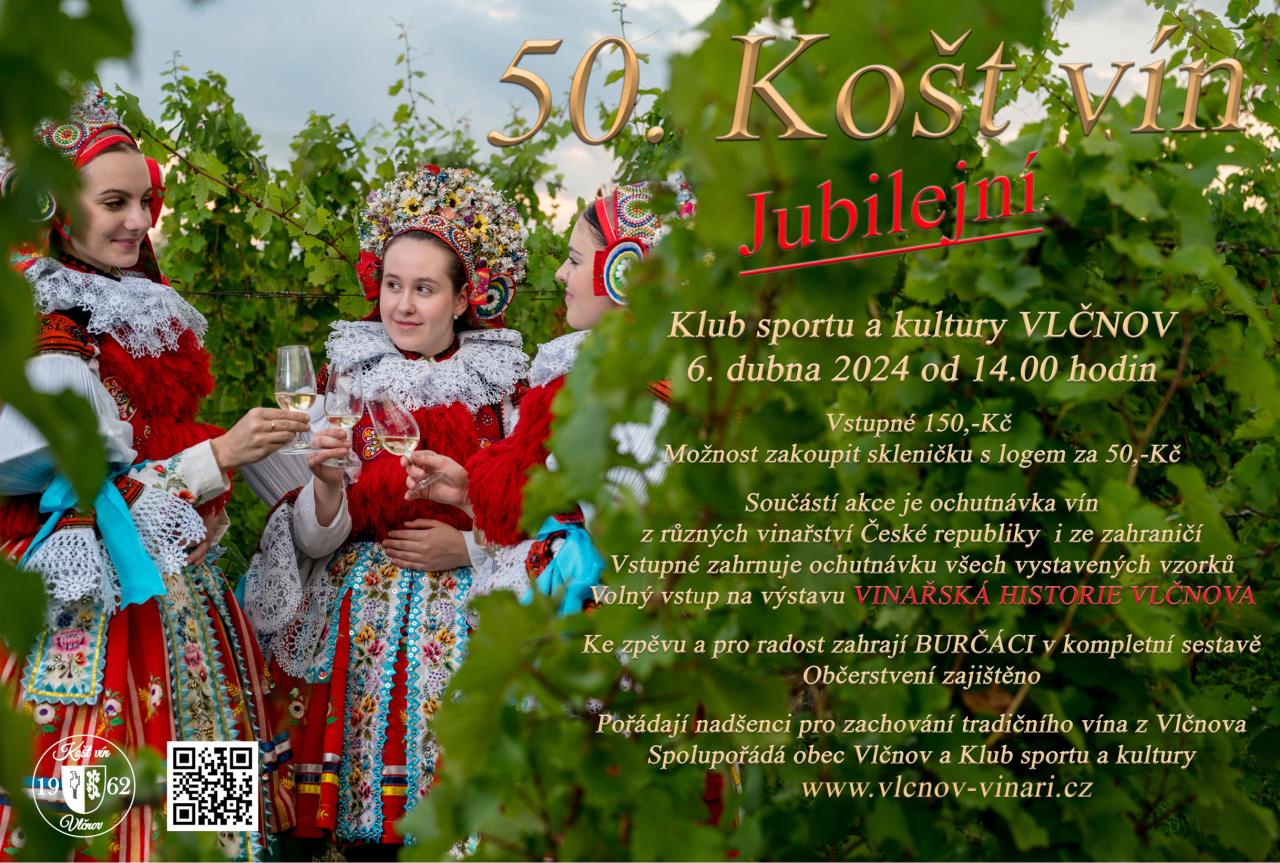 Nadšenci z Vlčnova srdečně zvou na 50. Košt vína. Koná se 6. dubna od 14 hodin v sále Klubu sportu a kultury. Vstupné je 150,- Kč a zahrnuje ochutnávku všech vzorků a volný vstup na výstavu. Občerstvení zajištěno, pro radost hrají BURČÁCI.