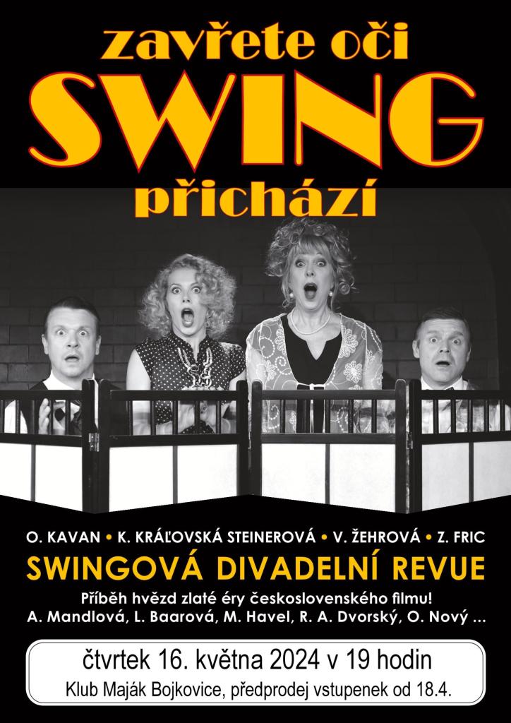 Pražské Divadlo v Řeznické přiveze 16. května skvělé představení s názvem ZAVŘETE OČI, SWING PŘICHÁZÍ ...Více informací v přiloženém letáku.