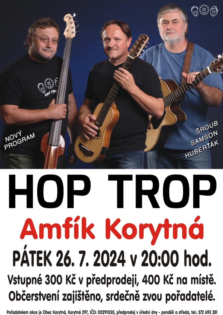 Obec Korytná pořádá koncert skupiny HOP TROP, který se koná v pátek 26. 7. od 20:00 hodin v Amfíku v Korytné. Vstupné 300,- Kč v předprodeji, 400,- Kč na místě. Občerstvení zajištěno. Více informací v přiloženém plakátě.