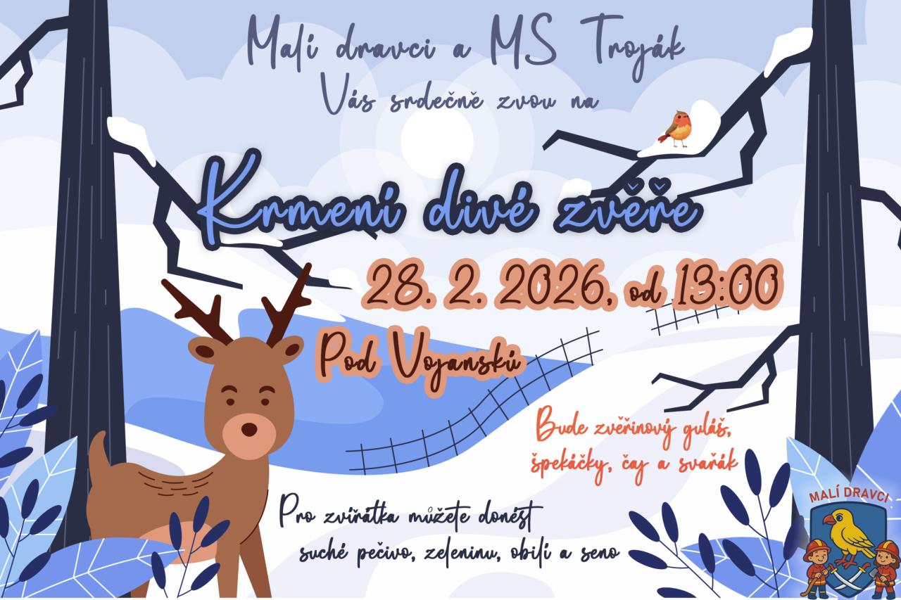 Malí dravci a MS Troják Vás srdečně zvou na Krmení divé zvěře. Akce se bude konat v sobotu 28. února od 13 hodin Pod Vojanskú. Pro zvířátka můžete donést suché pečivo, zeleninu, obilí a seno. Občerstvení zajištěno.