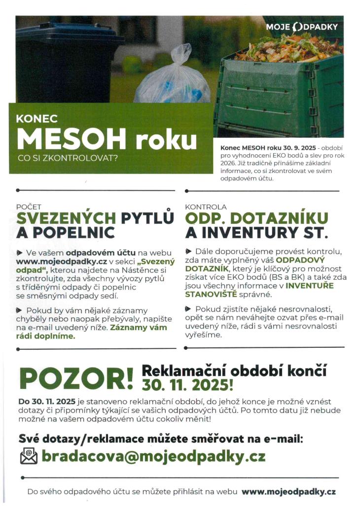 Nastává období pro vyhodnocení EKO bodů. Od 1. 11. do 30. 11. je ustanoveno reklamační období, během kterého občané mohou vznést reklamaci nebo připomínku ke stavu jejich bodového ohodnocení. Své dotazy/reklamace můžete směřovat na e-mail: bradacova@mojeodpadky.c