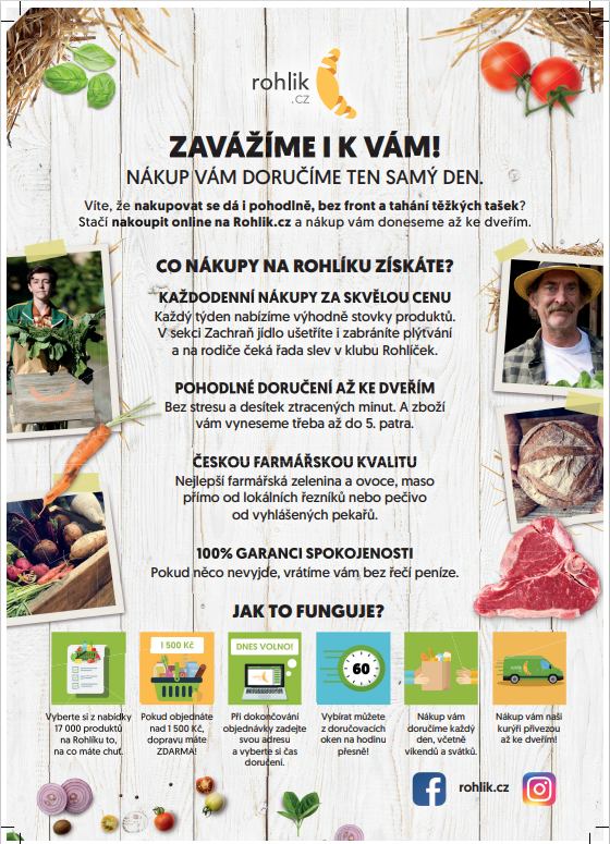 Tento týden jsme začali rozvážet nákupy z Rohlik.cz i do Bystřice pod Lopeníkem. Díky tomu si mohou vaši obyvatelé teď jednoduše a rychle nakoupit online a my jim jejich nákup do pár hodin přivezeme až ke dveřím, dokonce i během víkendů a svátků. Více informací v přiložených letácích.