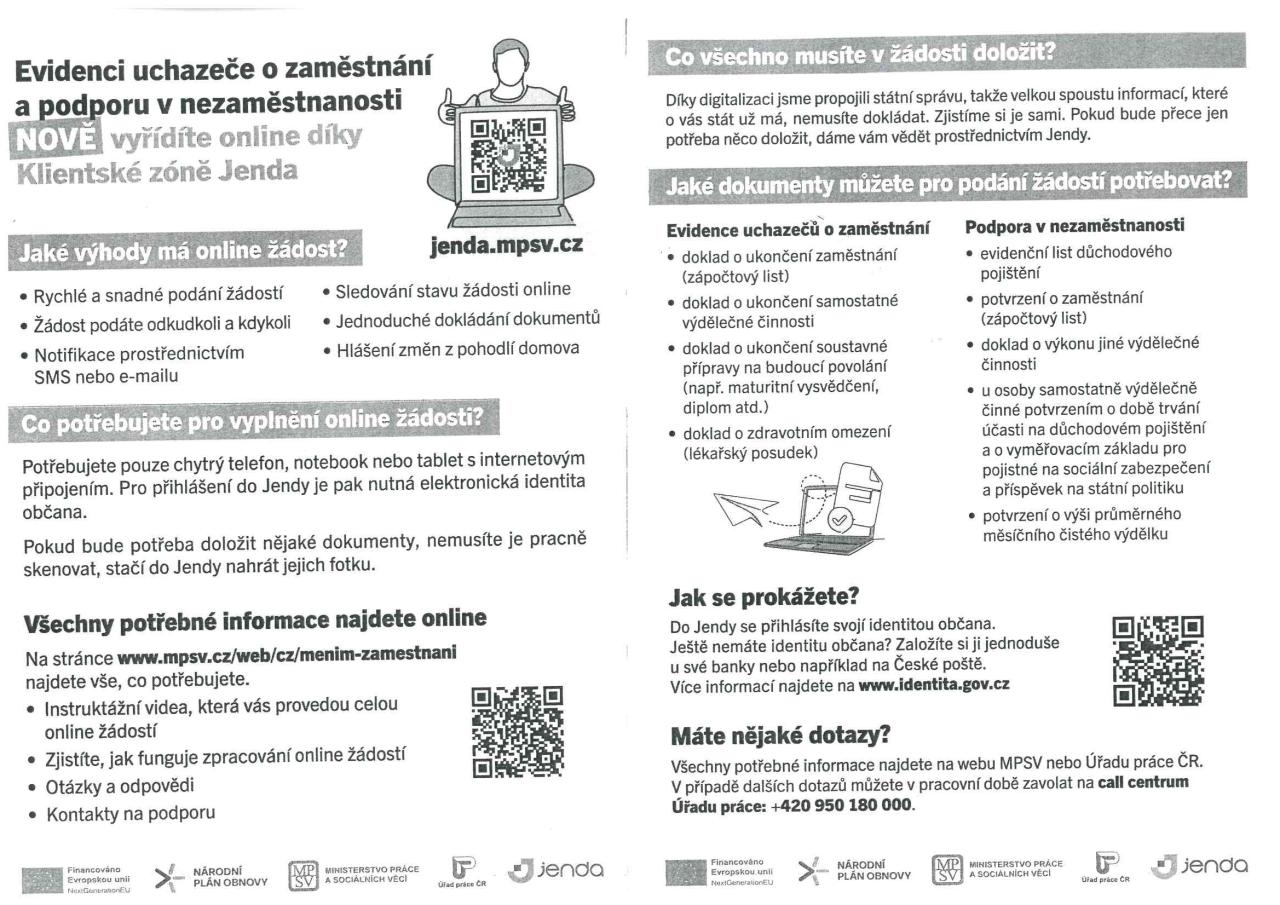 Všechny potřebné informace pro evidenci uchazeče o zaměstnání a podporu v nezaměstnanosti najdete v přiloženém letáku nebo na webu MPSV.