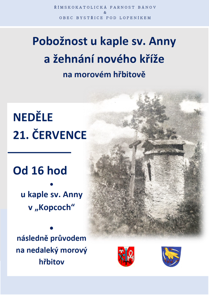 V neděli 21. 7. se bude konat od 16 hodin pobožnost u kaple sv. Anny a žehnání nového kříže na morovém hřbitově.
