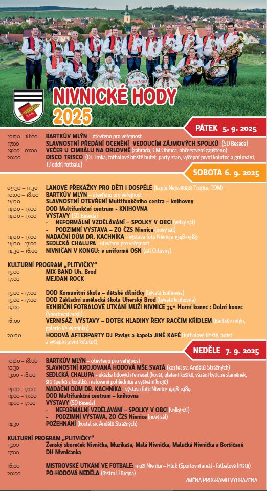 Obec Nivnice srdečně zve na letošní Nivnické hody. Bližší informace o hodovém programu jsou v přiloženém plakátě.