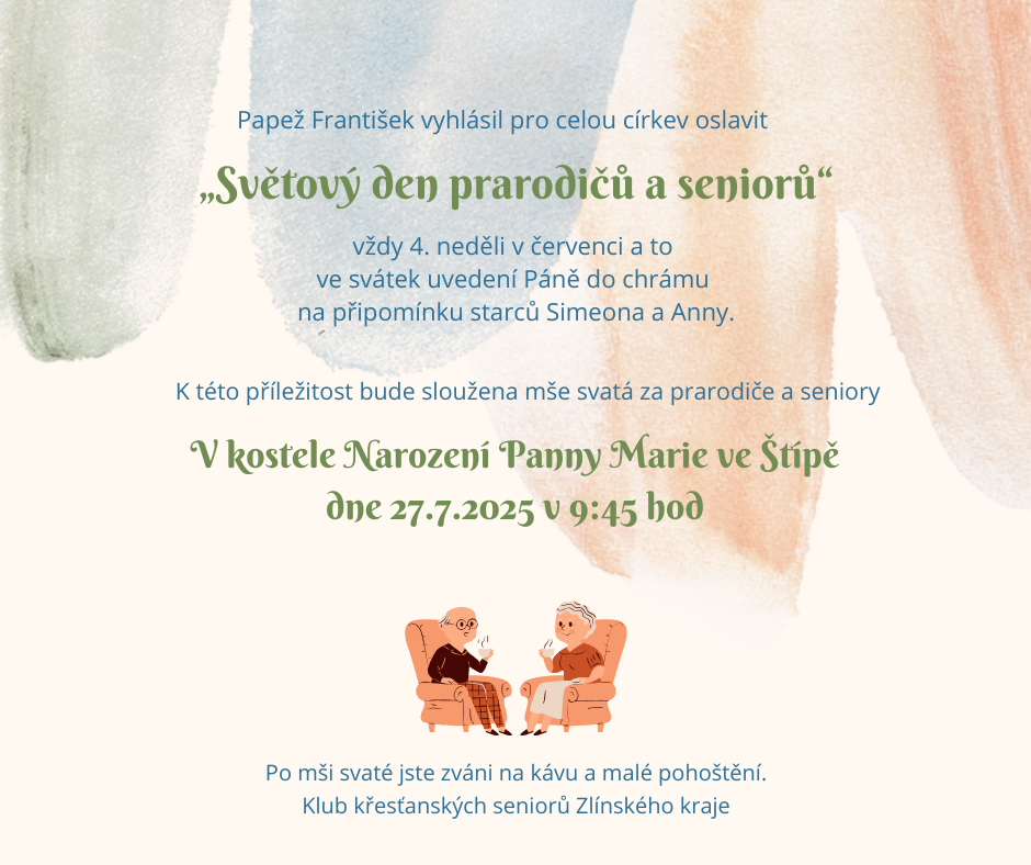 dovolujeme si Vás jménem Klubu křesťanských seniorů pozvat v neděli 27.7. 2025 v 9:45 do kostela Narození Panny Marie ve Štípě na poutní mši za prarodiče a seniory.