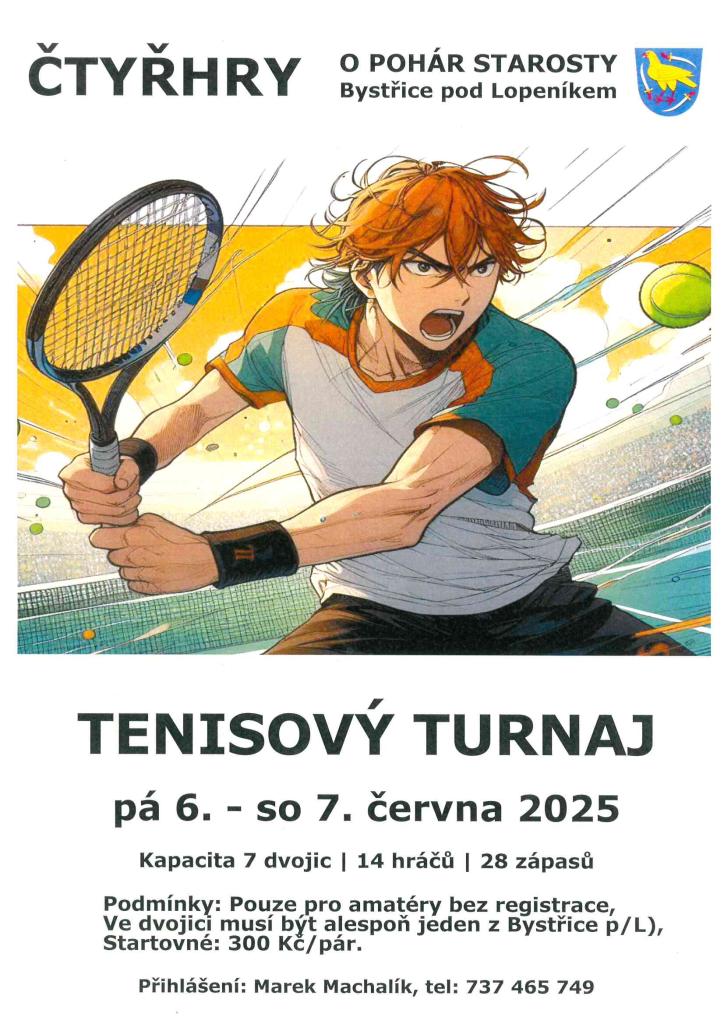 Srdečně zveme všechny hráče, hráčky a příznivce "bílého sportu" s pozvánkou k účasti na tenisovém turnaji ve čtyřhře "O pohár starosty Bystřice pod Lopeníkem", který se bude konat 6. - 7. června 2025.