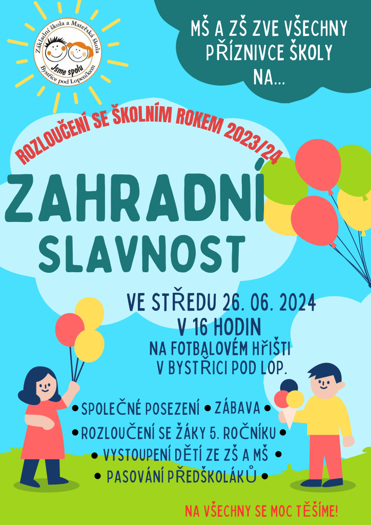 MŠ a ZŠ zve všechny příznivce školy na Zahradní slavnost, která se koná ve středu 26. 6. v 16 hodin na fotbalovém hřišti v Bystřici p. Lopeníkem.