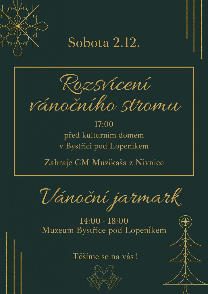 Obec Bystřice pod Lopeníkem srdečně zve v sobotu 2.12. od 14:00 do 18:00 hodin na Vánoční jarmark v muzeu a zároveň v 17:00 hodin na rozsvícení vánočního stromu. K vánoční atmosféře přispěje i cimbálová muzika Muzikaša z Nivnice.