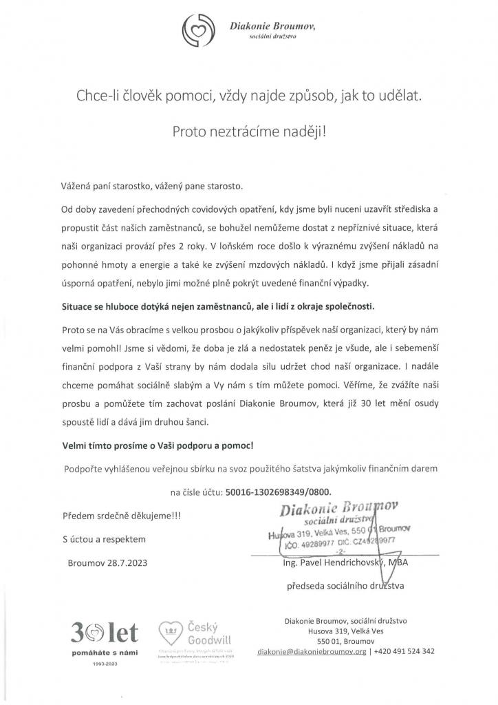 Z důvodů nepříznivé situace a kvůli zachování poslání, Diakonie Broumov prosí o jakýkoliv finanční příspěvek na udržení chodu organizace. Více informací v přiloženém dopise.