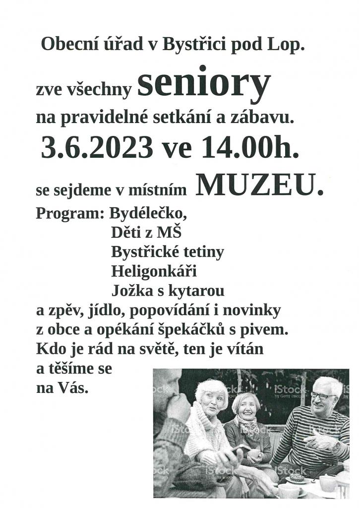 Obecní úřad v Bystřici pod Lopeníkem zve všechny seniory na pravidelné setkání, které se koná v sobotu 3. 6. ve 14 hodin v místním muzeu. Občerstvení a pestrý program zajištěn.