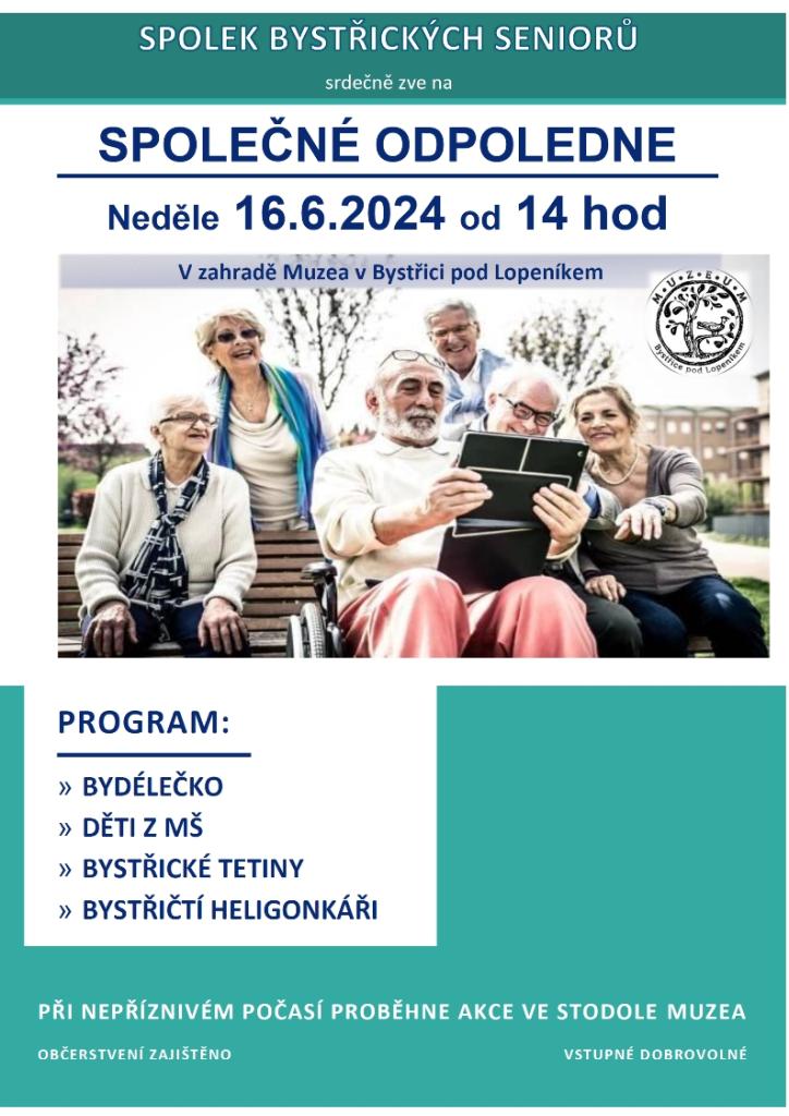 Spolek bystřických seniorů Vás srdečně zve na společné odpoledne v neděli 16.6. od 14hod v prostorách zahrady Muzea v Bystřici pod Lopeníkem. Podrobnosti akce viz přiložený plakát.