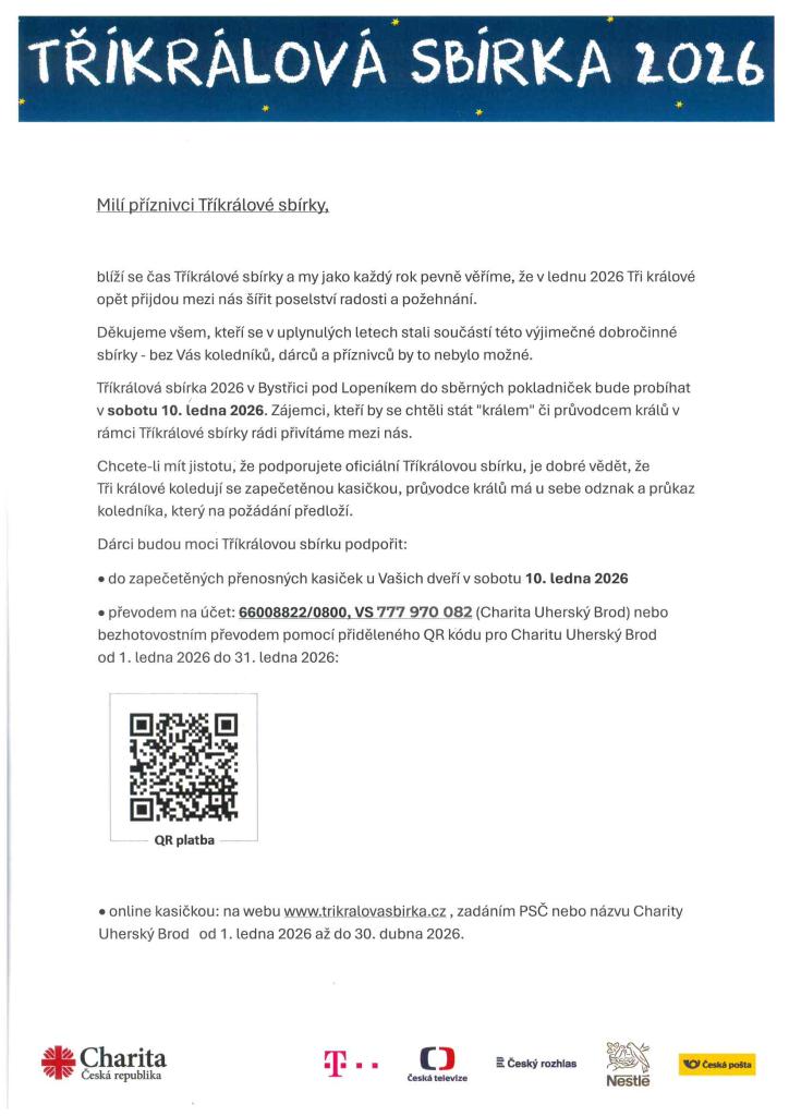 Oznamujeme občanům, že v sobotu 10. 1. 2026 bude probíhat v naší obci, v dopoledních hodinách, Tříkrálová sbírka. Více podrobností v přiloženém letáku.