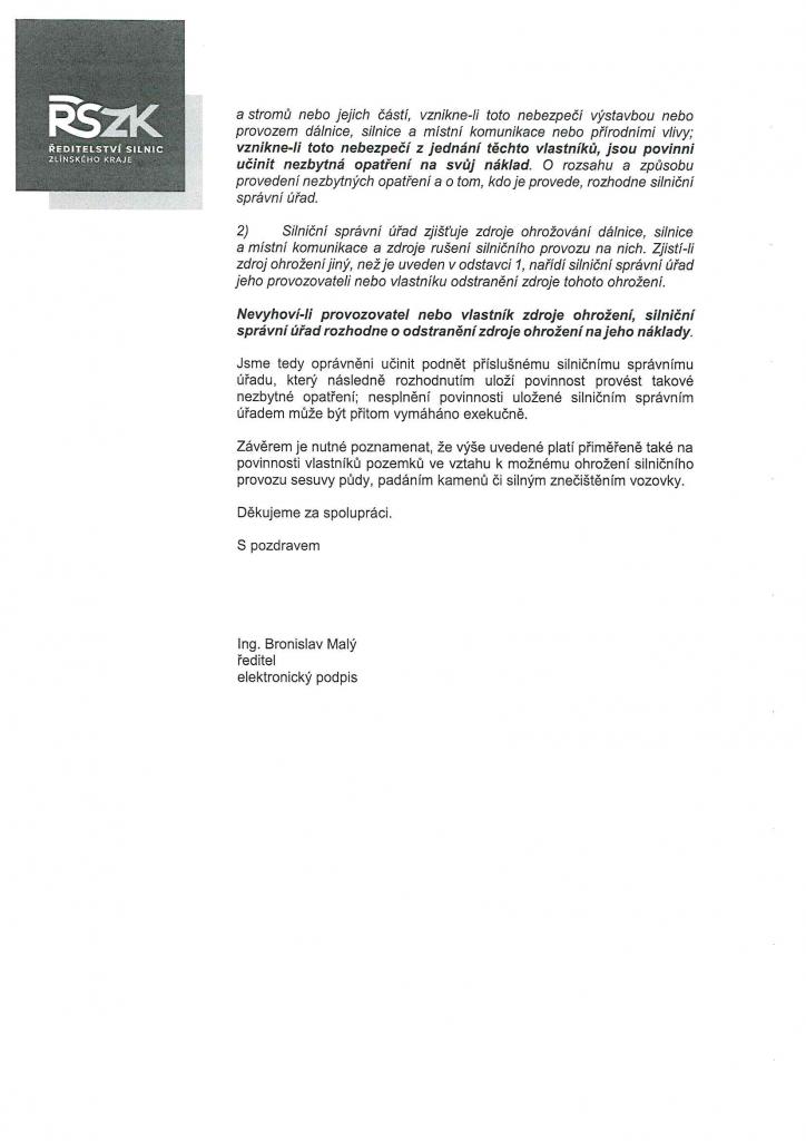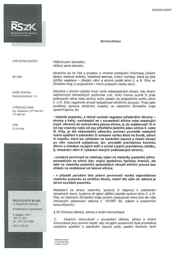 Ředitelství silnic Zlínského kraje požádala obecní úřad o spolupráci na zveřejnění informací pro vlastníky, správce či nájemce pozemků podél silnic II. a III. třídy týkající se ořezání větví a stromů. Bližší informace v přiloženém dopisu.