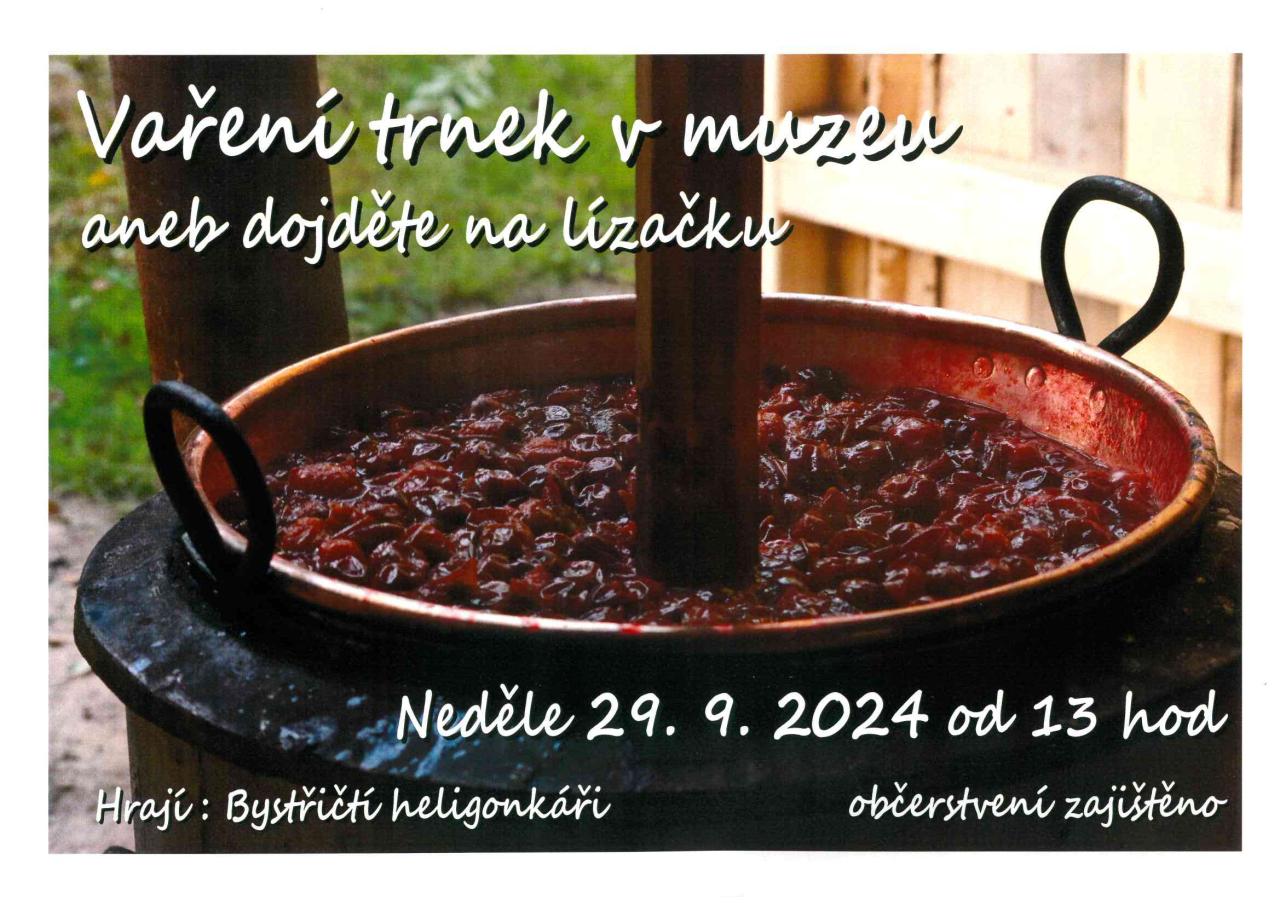 V muzeu bude v neděli 29. 9. 2024 od 13 hodin Vaření trnek. Všichni jsou srdečně zváni. Občerstvení zajištěno, hrát budou Bystřičtí helingonkáři.