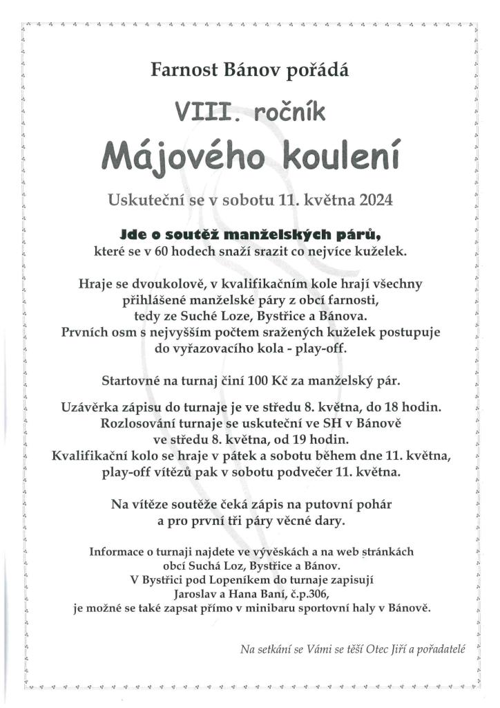 Farnost Bánov pořádá VIII. ročník Májového koulení. Uskuteční se v sobotu 11. května 2024. Startovné je 100Kč za pár.