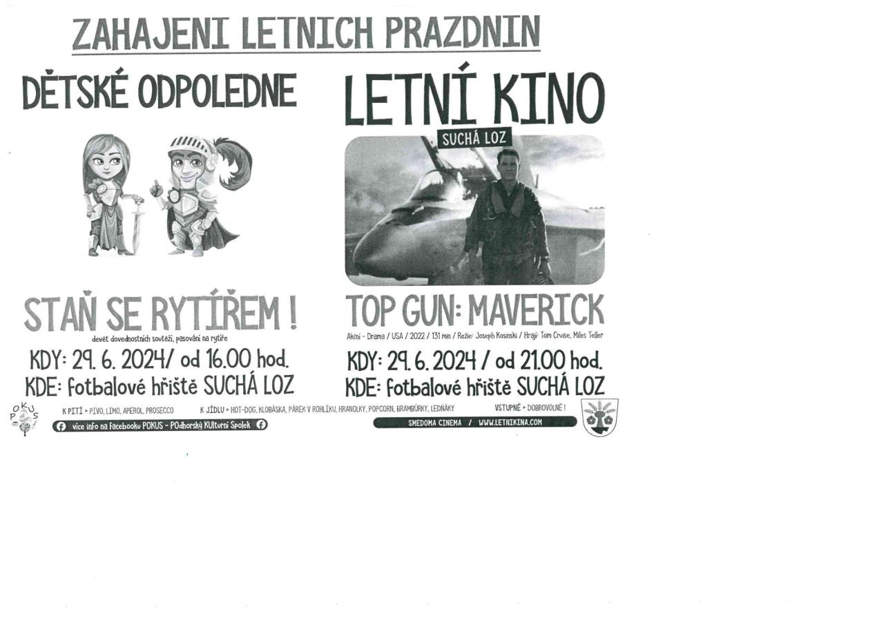 V Suché Lozi, na zahájení prázdnin, se koná v sobotu 29. 6. na fotbalovém hřišti od 16 hodin dětské odpoledne a od 21 hodin letní kino. Vstupné dobrovolné, občerstvení zajištěno.