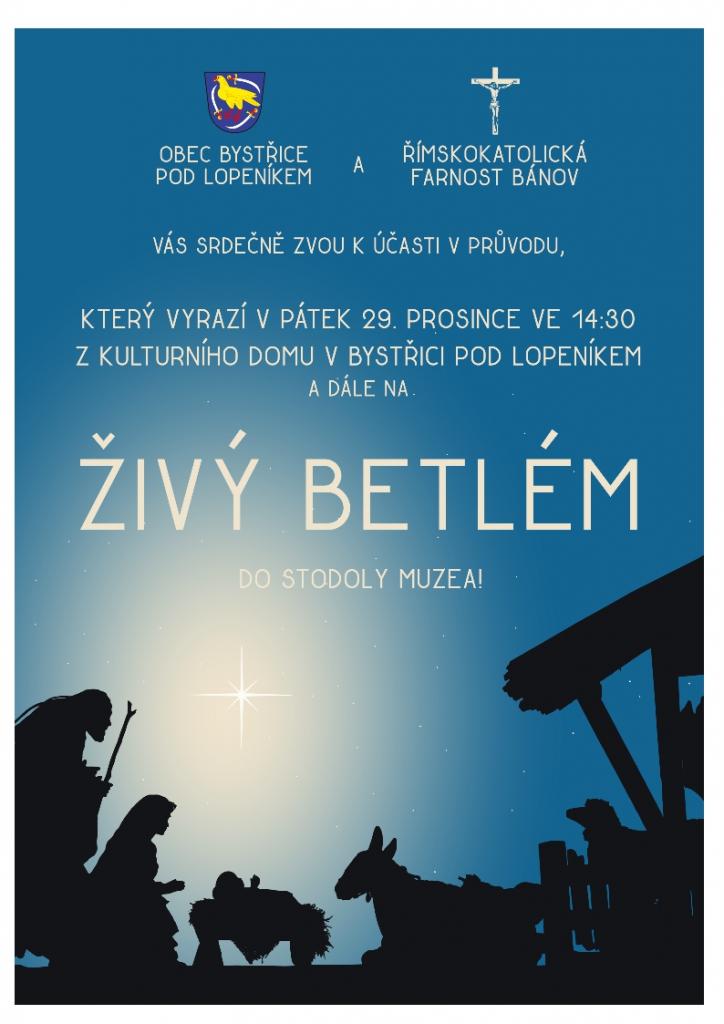 Obec Bystřice pod Lopeníkem a Římskokatolická farnost Bánov Vás srdečně zvou k účasti v průvodu, který vyrazí v pátek 29.12.2023 ve 14:30hod z kulturního domu v Bystřici pod Lopeníkem a dále na ŽIVÝ BETLÉM do stodoly muzea.