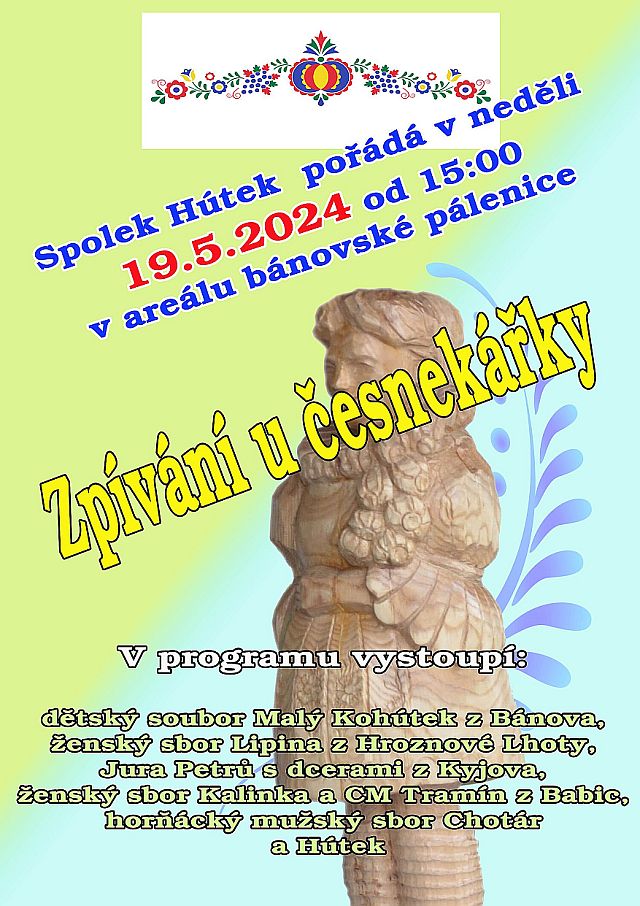 Spolek Hútek pořádá v neděli 19. 5. od 15:00 hodin v areálu bánovské pálenice - Zpívání u česnekářky. Více informací v přiloženém plakátu.