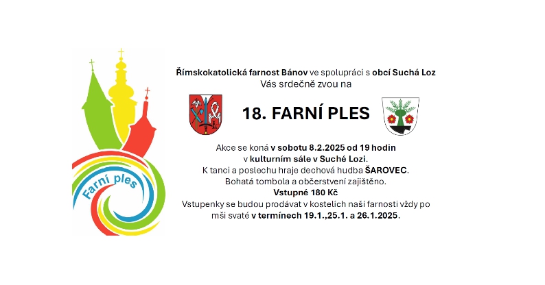 Římskokatolická farnost Bánov a obec Suchá Loz pořádají 18. Farní ples 8. února 2025 v kulturním sále v Suché Lozi. Těšit se můžete na dechovou hudbu ŠAROVEC, bohatou tombolu a občerstvení. Vstupné činí 180 Kč, vstupenky budou k dispozici po mších 19., 25. a 26. ledna.