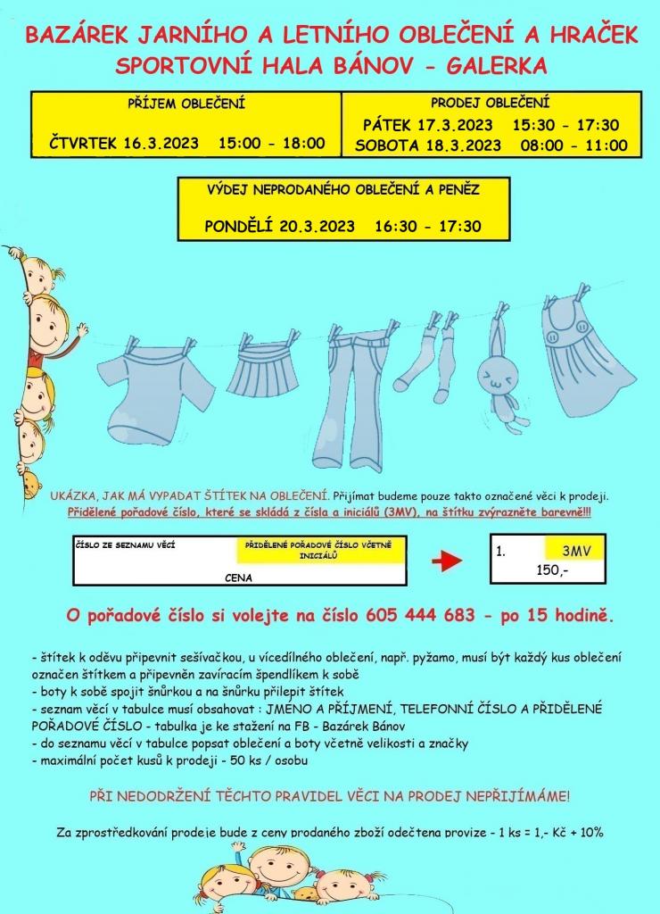 V Bánově od pátku 17. do soboty 18. března se bude konat bazárek oblečení a hraček. Více informací ohledně prodeje všech věcí je v přiloženém letáku.