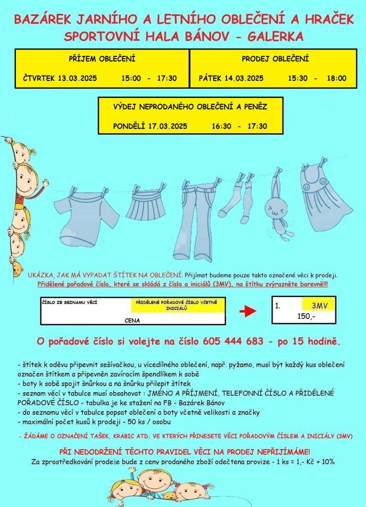 Po roce se bude opět konat Bazárek jarního a letního oblečení a hraček. Akce bude probíhat ve Sportovní hale v Bánově v pátek 14. března od 15:30 - 18:00 hodin. Podrobné informace v přiloženém letáku.