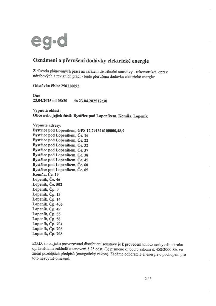 Z důvodu plánovaných prací na zařízení distribuční soustavy bude přerušena dodávka elektrické energie ve středu 23. 4. 2025 od 8:30 do 12:30 hodin. Vypnutá oblast Bystřice pod Lopeníkem - pod chatou Troják, Komňa, Lopeník. Podrobné informace v přiloženém letáku.