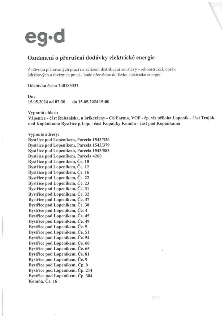 Společnost EG.D oznamuje přerušení dodávky elektrické energie z důvodů oprav a revizních prací. Vypnutá oblast: Lopeník - část Troják a nad Kopánkama. Podrobné informace v přiloženém letáku.
