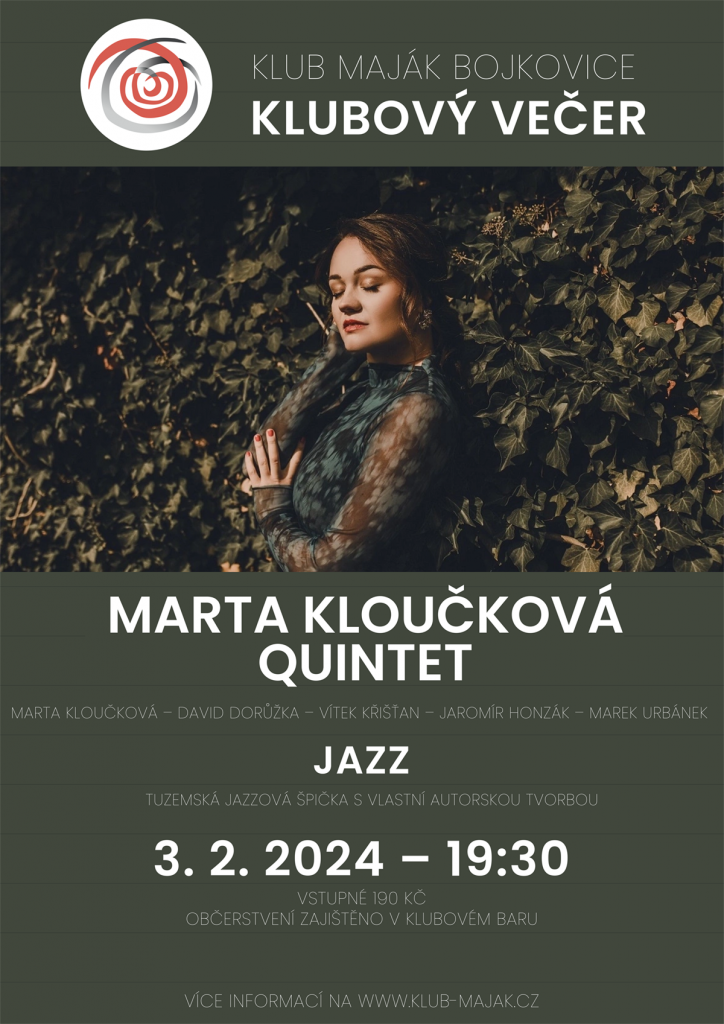 Klubový večer s multižánrovou zpěvačkou, skladatelkou, textařkou a publicistkou Martou Kloučkovou v doprovodu našich předních muzikantů, se odehraje už v sobotu 3. února v 19:30 hodin, vstupné 190,- Kč.