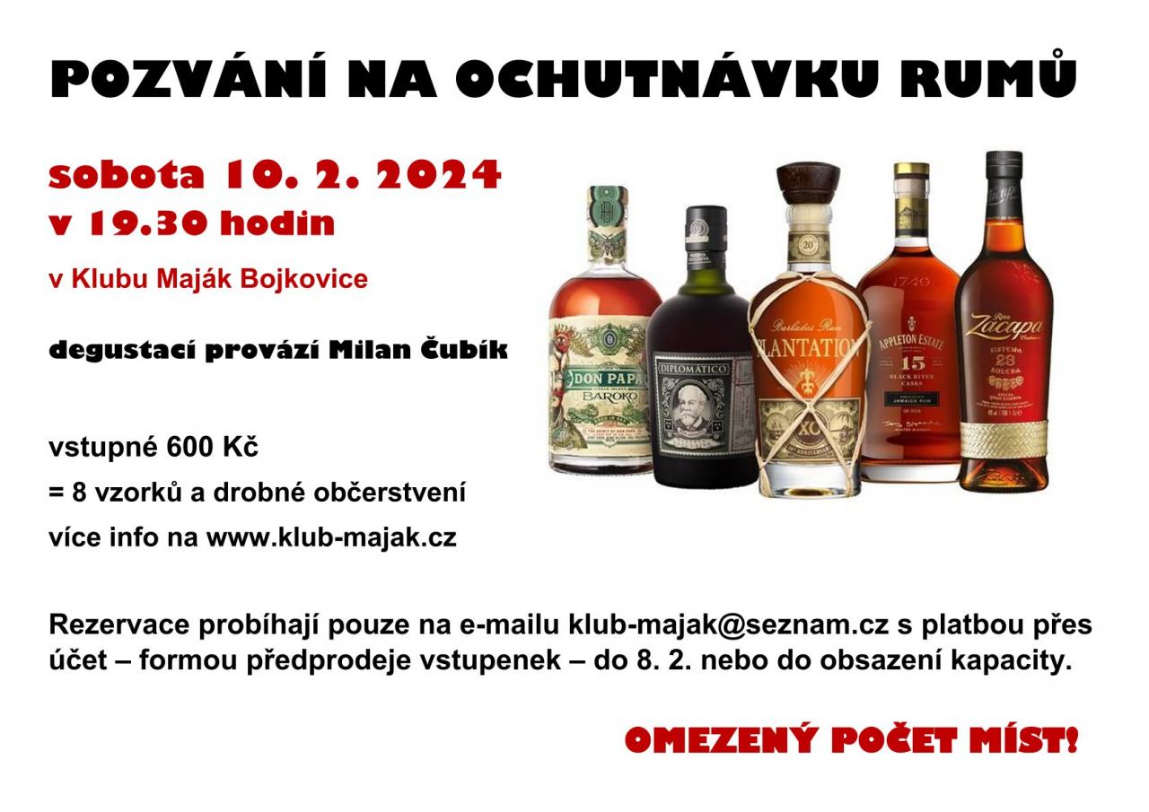 V sobotu 10. února v 19:30 hodin bude ochutnávku rumů, kterou si pro příznivce připravuje pan Milan Čubík. Je nutné si předem zaregistrovat místo a zakoupit vstupenku, a to do 8. 2., počet míst je omezen. Vstupné 600,- Kč. V ceně vstupného je osm vzorků a drobné občerstvení.
