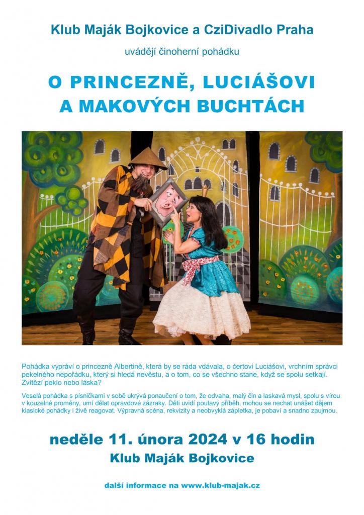 Klub Maják Bojkovice zve nejmenší diváky a jejich dospěláky ke společnému rodinnému odpoledni v divadle. Pohádka O princezně, Luciášovi a makových buchtách se zde odehraje v neděli 11. února od 16 hodin. Vstupné děti 100,- Kč, dospělí 120,- Kč.
