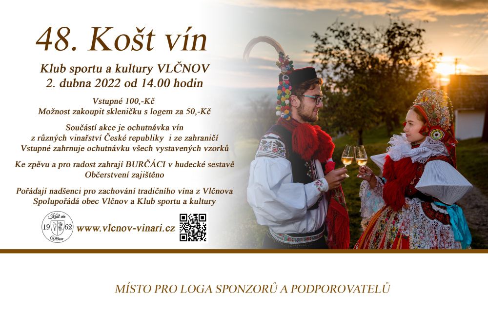 Klub sportu a kultury Vlčnov pořádá v sobotu 2. dubna 2022 od 14:00 hodin 48. ročník Košt vín. Vstupné 100,- Kč, občerstvení zajištěno. Bližší informace v letáku.