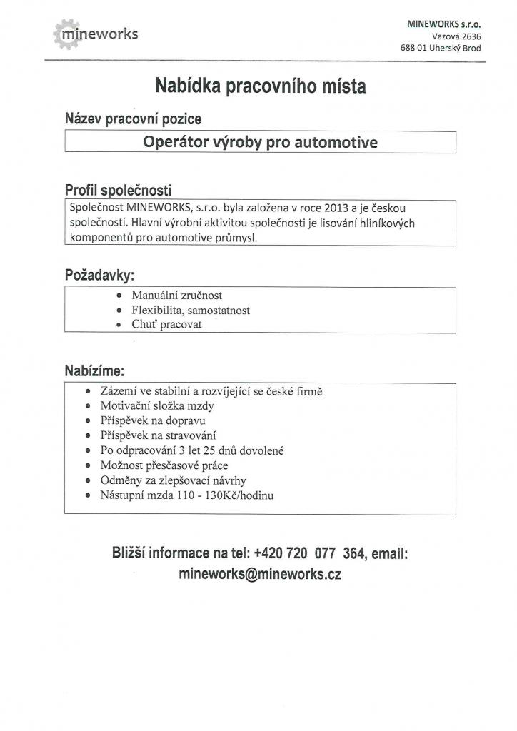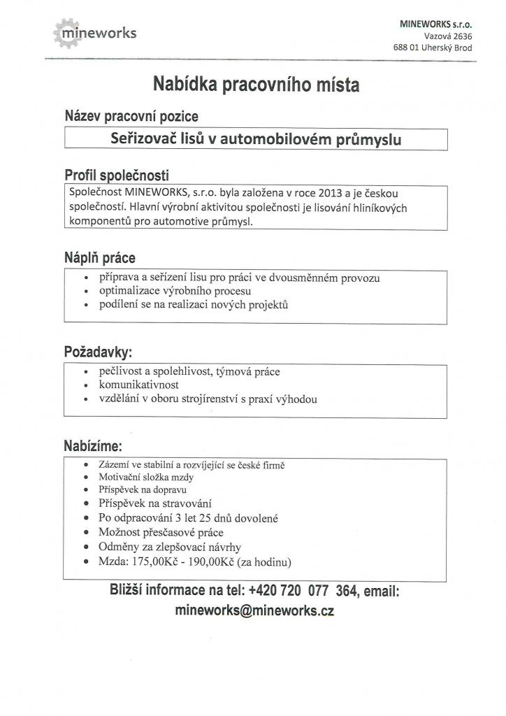 Firma Mineworks s.r.o. z Uherského Brodu nabízí několik volných pracovních pozic. Více informací v letácích.