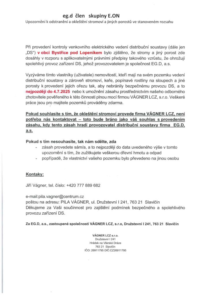nebo k umožnění tohoto zásahu firmě VÁGNER LCZ, s.r.o., odbornému zhotoviteli, pověřeného k této činnosti plnou mocí. Veškeré práce jsou pro majitele pozemků prováděny zdarma. Plakát s podrobnými informacemi je vyvěšen ve vývěsní skříňce.