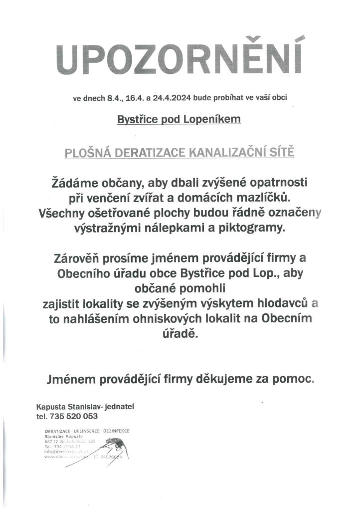 Ve dnech 8., 16. a 24. dubna 2024 bude probíhat v naši obci plošná deratizace kanalizace. Žádáme občany o nahlášení lokality se zvýšeným výskytem hlodavců na obecním úřadě. Všechny ošetřené plochy budou označeny nálepkami, dbejte zvýšené opatrnosti při venčení zvířat.