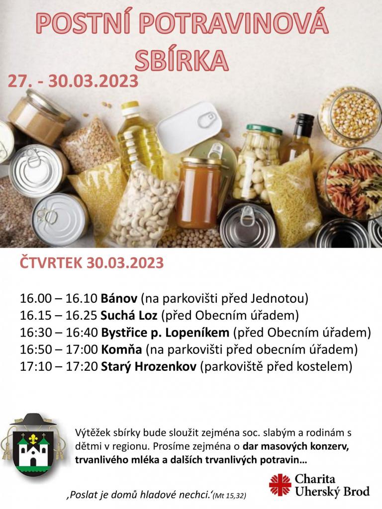 Dnes od 16:30 do 16:40 hodin se bude konat před obecním úřadem potravinová sbírka pro sociálně slabé a rodiny s dětmi. Do sbírky můžete darovat masové konzervy, těstoviny, zavařeniny a další trvanlivé potraviny.