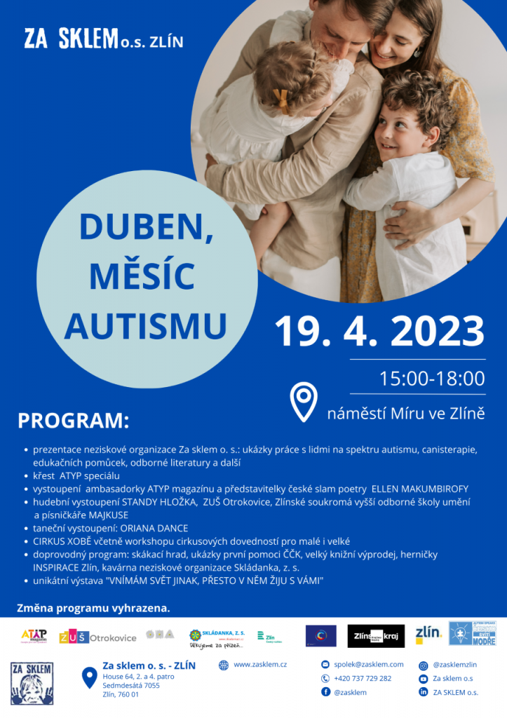 Dovolujeme si Vás pozvat jménem předsedkyně organizace Za sklem o. s. paní Marty Pečeňové na Den otevřených dveří, který proběhne v pátek 14. 4. 2023 a na akci Duben, měsíc autismu, která se uskuteční ve středu 19. 4. 2023.