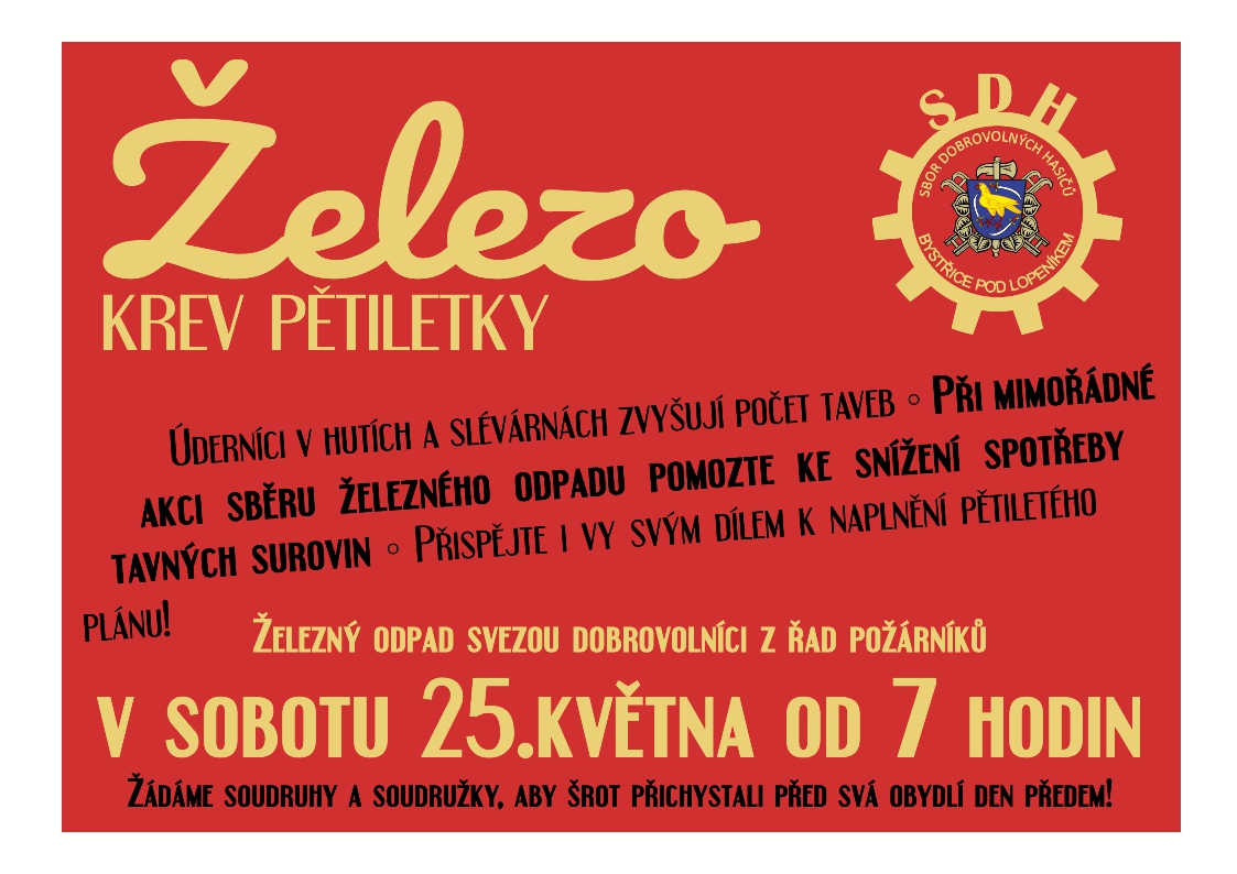 Sbor dobrovolných hasičů bude v sobotu 25. května od 7 hodin provádět sběr železného odpadu. Připravte si železo před dům den předem.