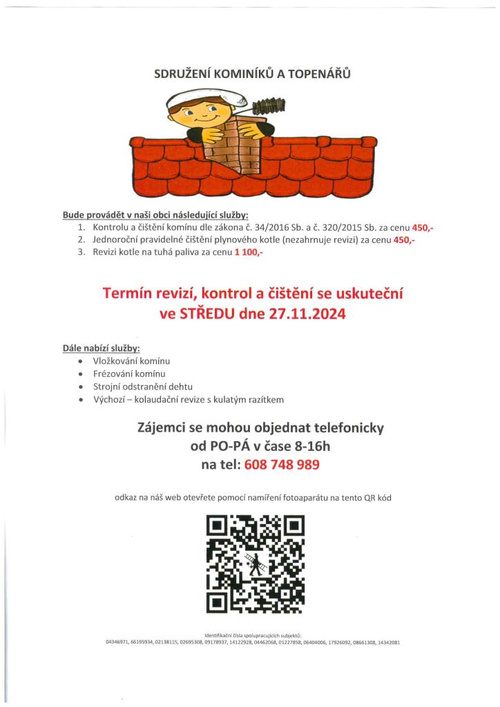 bude provádět v naší obci ve STŘEDU dne 27.11. požadované kontroly a čištění komínů dle zákonu č. 34/2016 Sb. za 450 Kč, čištění plynových kotlů za 450 Kč a revize kotlů na tuhá paliva za 1 100 Kč. Dále nabízí vložkování a frézování komínů. Zájemci se mohou objednat na t. č.: 608 748 989.