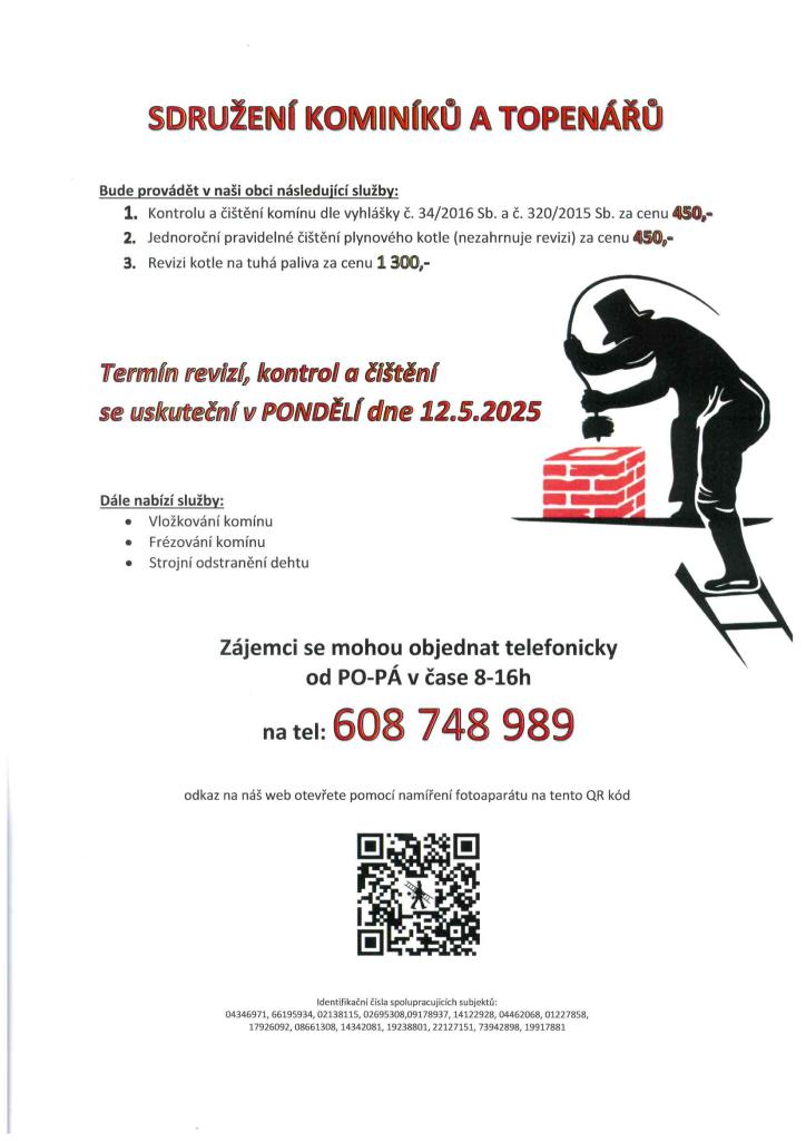 Sdružení kominíků a topenářů bude provádět v naší obci v PONDĚLÍ dne 12.5. kontroly a čištění komínů dle zákonu č. 34/2016 Sb. za následující ceny: - Čištění komínů: 450 Kč - Čištění plynových kotlů: 450 Kč - Revize kotlů na tuhá paliva: 1.300 Kč Objednáv telefonicky na t. č. 608 748 989.