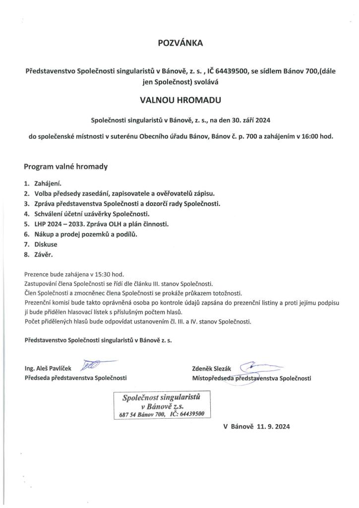 Představenstvo Společnosti singularistů v Bánově svolává Valnou hromadu na den 30. září 2024 do společenské místnosti v suterénu Obecního úřadu Bánov a zahájením v 16 hodin. Více informací v přiložené pozvánce.