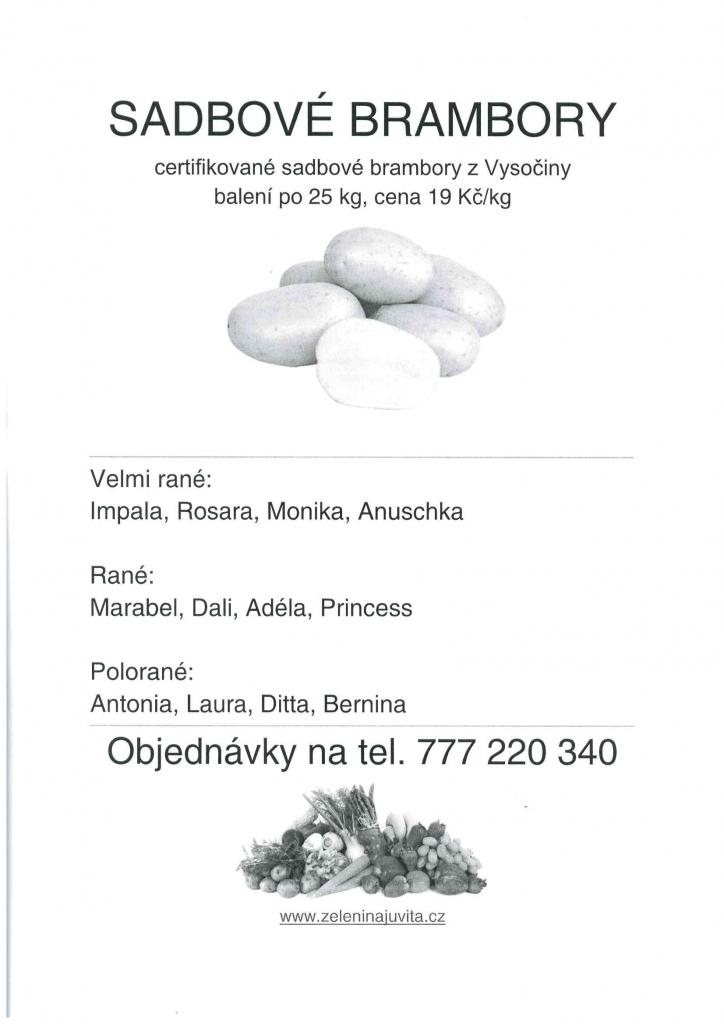 Zelenina Juvita Uherský Brod bude v pátek 14.4. od 13:30 do 13:50 h prodávat brambory, sazenice jahod a skalniček, cibulku sazečku, česnek, cibuli, jablka a další ovoce a zeleninu. Řidič přijímá objednávky na sadbové brambory na telefonním čísle: 777 220 340.